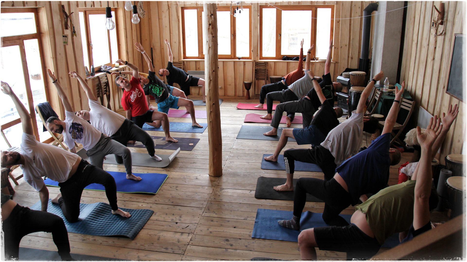 - Zaczynamy od godzinnej yogi – dużo rozciągania i ćwiczeń wzmacniających zwłaszcza mięśnie kręgosłupa, praca z oddechem.
